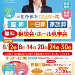 有限会社星野葬祭 家族葬の想 駅南では、「直葬・一日葬・家族葬」に関する無料相談会&ホール見学会を開催いたします。相談・見積ともに無料で、事前予約も不要。葬儀や供養に関する疑問をお持ちの方は、どなたでもお気軽にお越しください。 開催日:2025年8月2日(土)、8日(金)、14日(木)、20日(水)、24日(日)、30日(土) 時間:9:00~14:00(雨天決行) お好きな時間にご来場いただけま…7月の個別相談会&ホール見学会のお知らせ
