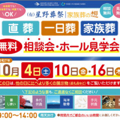 家族葬の想 駅南では、2025年11月に「直葬・一日葬・家族葬」に関する無料相談会&ホール見学会を開催いたします。葬儀の形式や費用に関する疑問にお応えするほか、式場内の設備や雰囲気も実際にご覧いただける機会です。相談・見積はすべて無料。事前のご予約も不要で、どなたでもご参加いただけます。 【開催日程】 11月4日(土)、7日(金)、13日(木)、19日(水)、24日(月・祝)、30日(日) 時間:…10月無料相談会&ホール見学会のお知らせ